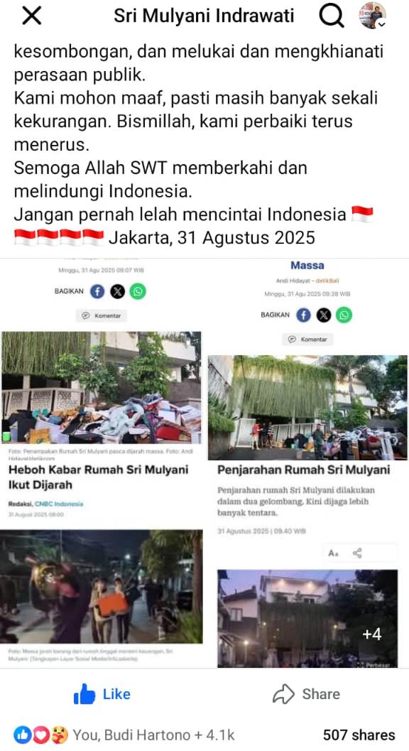 “Mari kita jaga dan bangun Indonesia bersama, tidak dengan merusak, membakar, menjarah, memfitnah, pecah belah, kebencian, kesombongan, serta melukai perasaan publik. Kami mohon maaf, pasti masih banyak kekurangan. Bismillah, kami perbaiki terus menerus,” tulisnya.