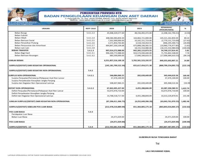 MATARAMRADIO.COM – Pemerintah Provinsi Nusa Tenggara Barat (NTB) menyampaikan laporan realisasi Anggaran Pendapatan dan Belanja Daerah (APBD) Tahun Anggaran 2024 sebagai bentuk pertanggungjawaban kepada masyarakat atas penggunaan dana publik dalam pelaksanaan pembangunan daerah.