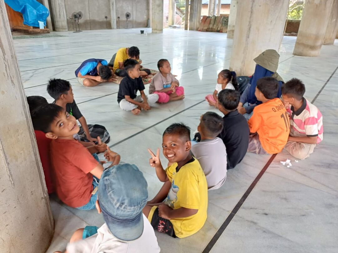 Posko Pengungsian Krung Lingka, melalui intervensi kelompok dan penguatan rutinitas spiritual bagi 19 anak dan remaja usia 4–18 tahun.