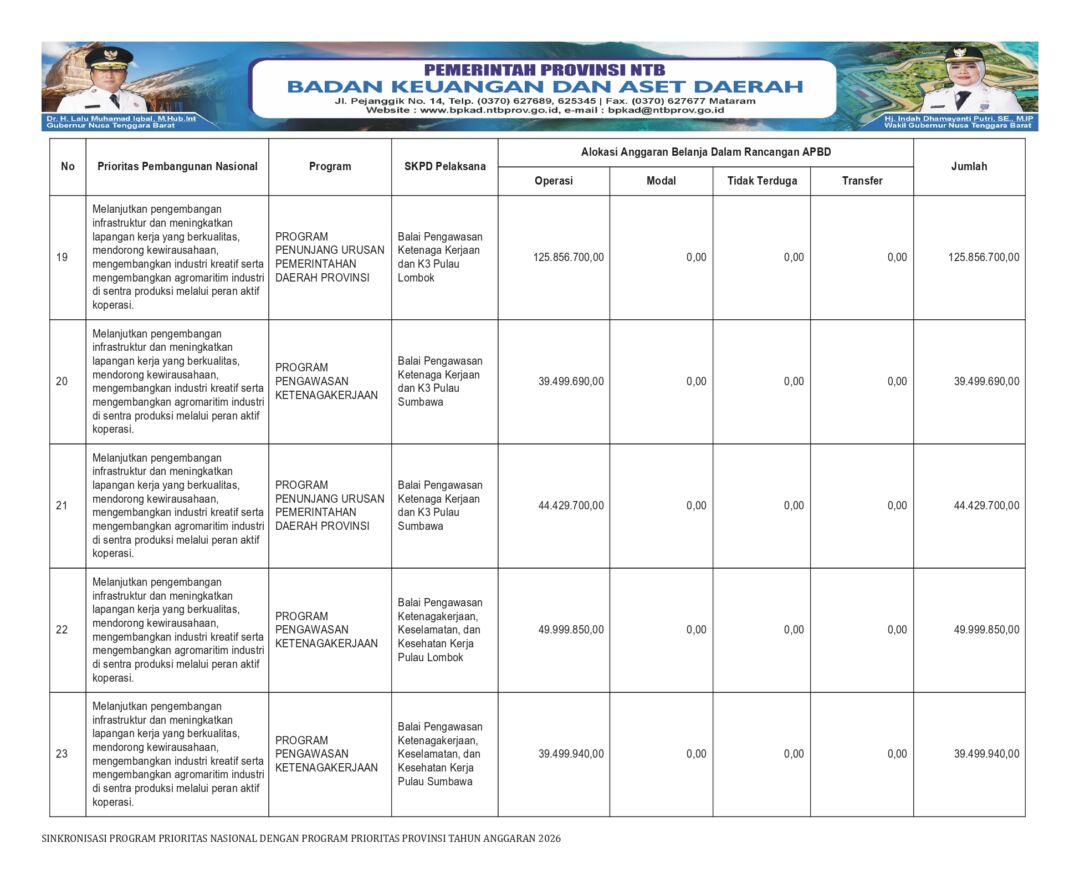 Melalui sejumlah program strategis, Pemprov NTB mengalokasikan anggaran untuk mendukung fungsi pengawasan ketenagakerjaan dan keselamatan kerja sebagai fondasi terciptanya iklim kerja yang sehat, aman, dan produktif. Program ini diharapkan mampu mendorong terciptanya lapangan kerja yang lebih berkualitas sekaligus meningkatkan daya saing tenaga kerja daerah.