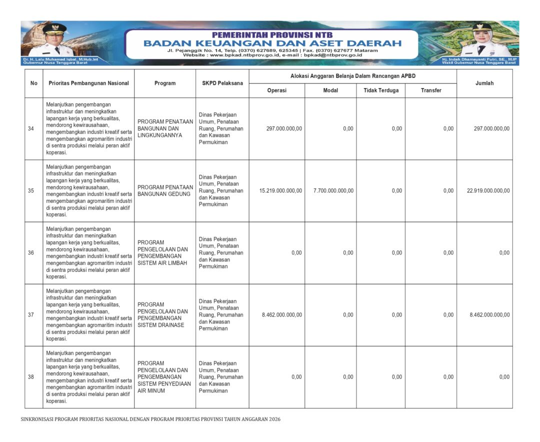 MATARAMRADIO.COM – Sinkronisasi Program Prioritas Nasional dengan Program Prioritas Provinsi Tahun Anggaran 2026 terus diarahkan untuk mempercepat pembangunan infrastruktur dasar yang berkualitas, mendukung penciptaan lapangan kerja, serta meningkatkan kualitas hidup masyarakat.