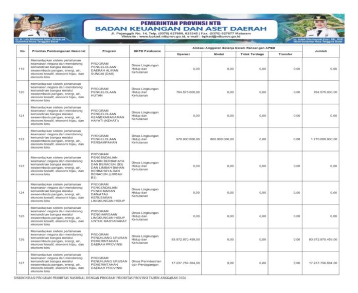 Melalui proses sinkronisasi program prioritas nasional dengan program prioritas provinsi, sejumlah program strategis di bawah koordinasi Dinas Lingkungan Hidup dan Kehutanan serta Dinas Perindustrian dan Perdagangan mendapatkan alokasi dalam Rancangan APBD 2026.