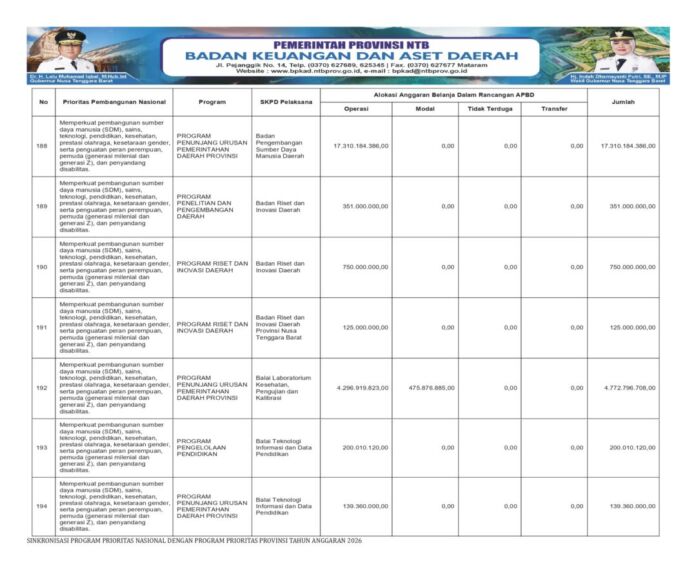 MATARAMRADIO.COM – Pemerintah Provinsi NTB terus mempertegas komitmennya dalam menyelaraskan arah kebijakan daerah dengan Prioritas Pembangunan Nasional Tahun Anggaran 2026, khususnya dalam agenda strategis memperkuat pembangunan sumber daya manusia (SDM), sains dan teknologi, pendidikan, kesehatan, prestasi olahraga, kesetaraan gender, serta penguatan peran perempuan, pemuda (generasi milenial dan generasi Z), dan penyandang disabilitas.