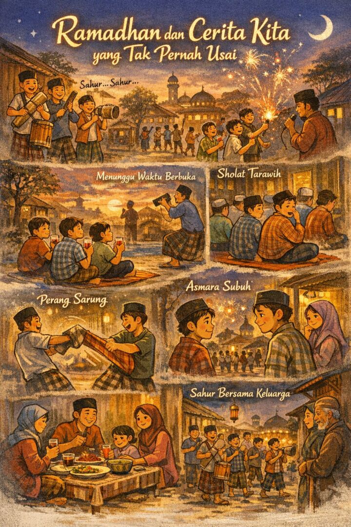 Ramadhan mungkin tetap datang setiap tahun. Tapi Ramadhan masa kecil dengan segala suara sumbang, tawa pecah, dan cahaya lampu masjid yang temaram ia tinggal dalam ingatan. Dan setiap kali kita membukanya, kenangan itu seperti pintu yang tak ingin ditutup kembali.